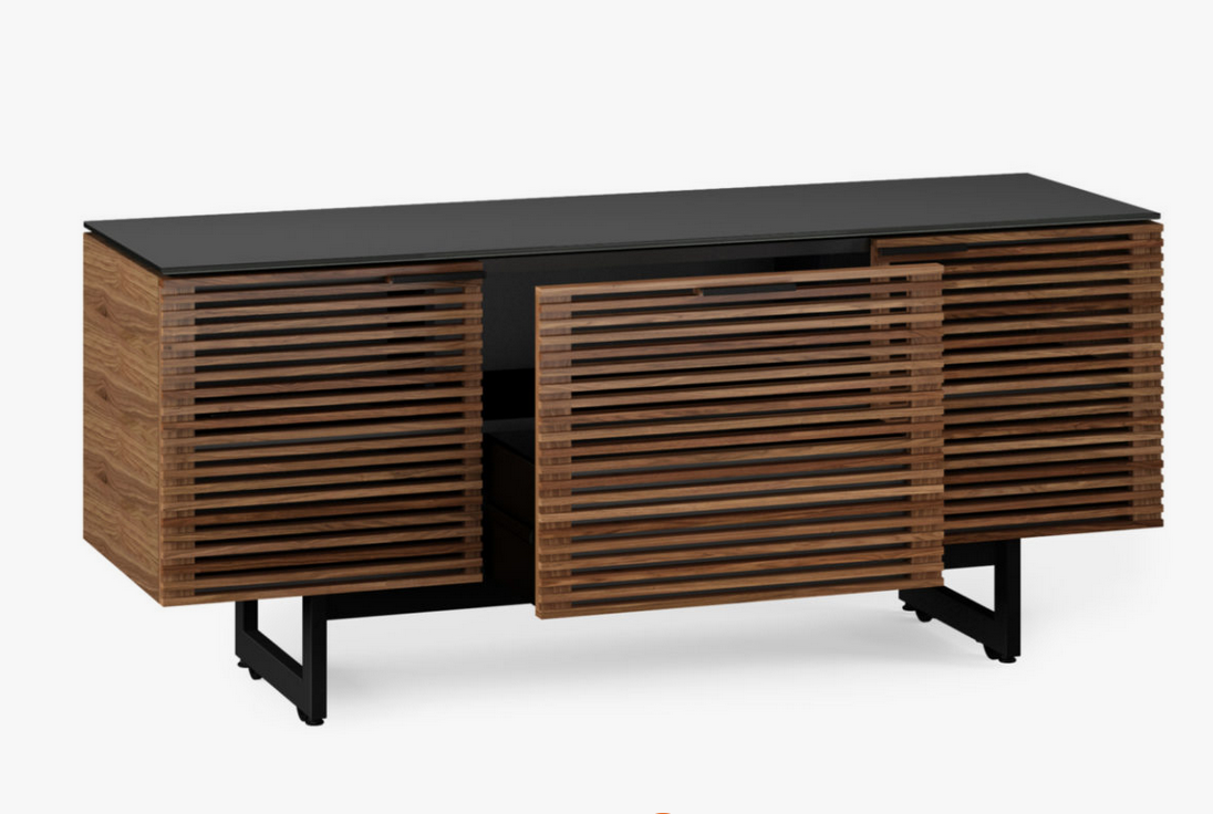 The Corridor Media Center by BDI lets you support your TV, house your media and accessories, and hide any unseemly mess and cables. Three louvered doors hide three cabinets with adjustable shelves, giving you plenty of space to store anything from speakers or a stereo to BluRay discs and DVDs. The doors' design allows the passage of sound and remote control signals while still keeping your things out of sight.