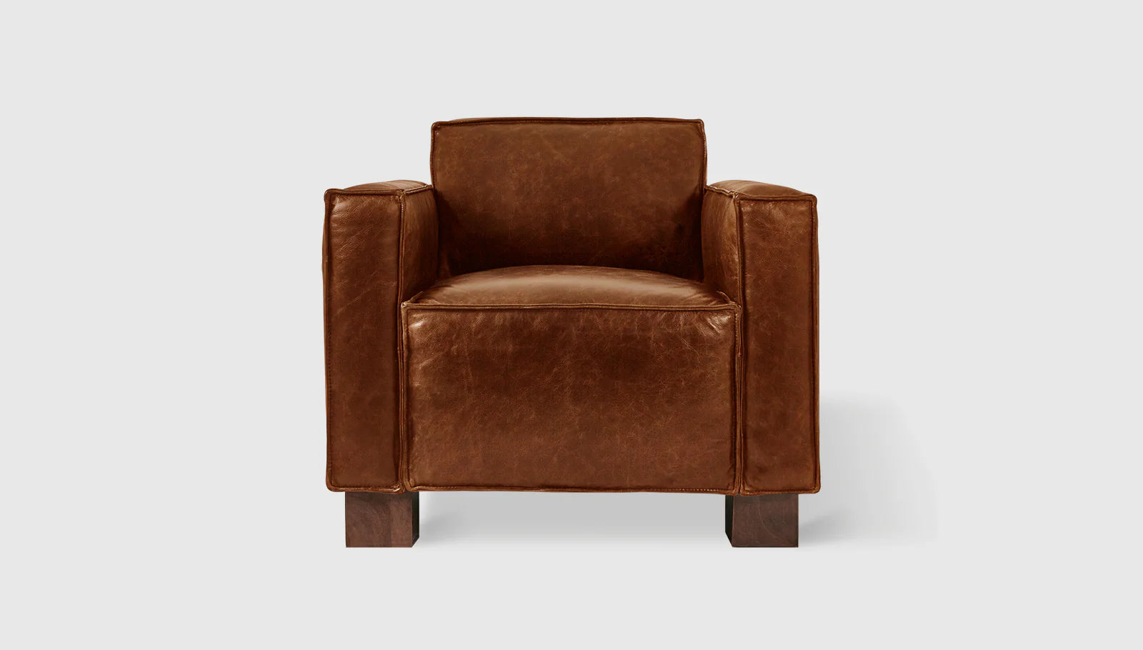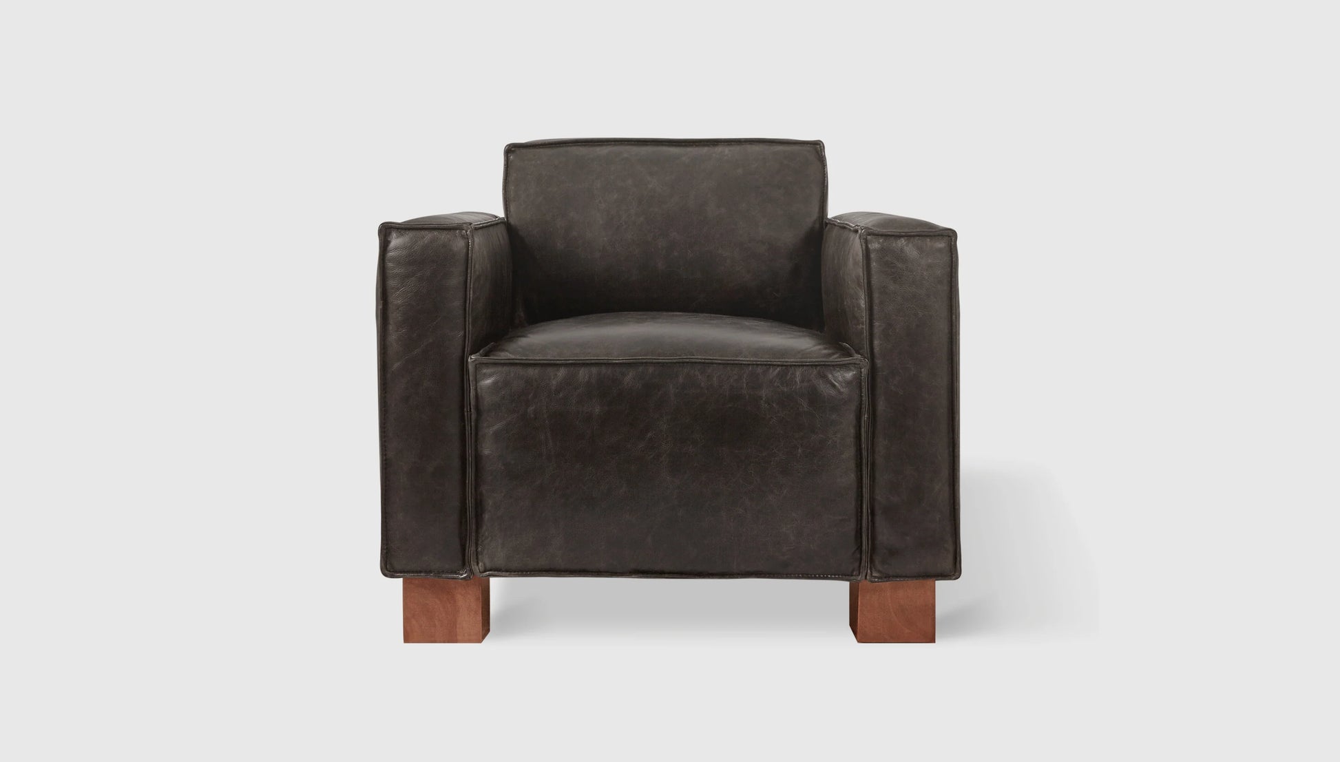 The Cabot Chair features a tight seat and back, with architectural, wood block feet and simple French seams, offering a comfortable, modern take on a traditional, masculine design. Available in three vintage leathers chosen for their unique grain characteristics that will age beautifully and develop a rich, natural patina over time. Also available as a sofa. Our leather hides are carefully selected for their raw, natural surface characteristics which make each piece unique.