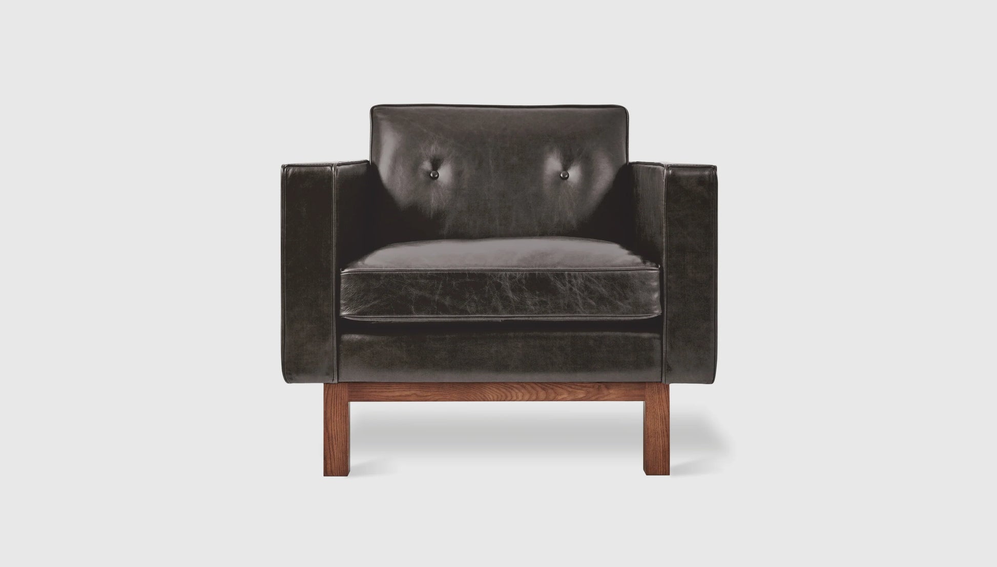 The Embassy Chair conveys a classic, mid-century style with tailored proportions and refined details. It features a button-tufted, tight back design with piping details throughout, and a seat cushion filled with luxurious synthetic-down. The frame is supported by a recessed, solid-wood base. Available in three vintage leathers, chosen for their unique grain characteristics that will age beautifully and develop a rich, natural patina over time. Also available as a sofa. Our leather hides are carefully selected for their raw, natural surface characteristics which make each piece unique.
