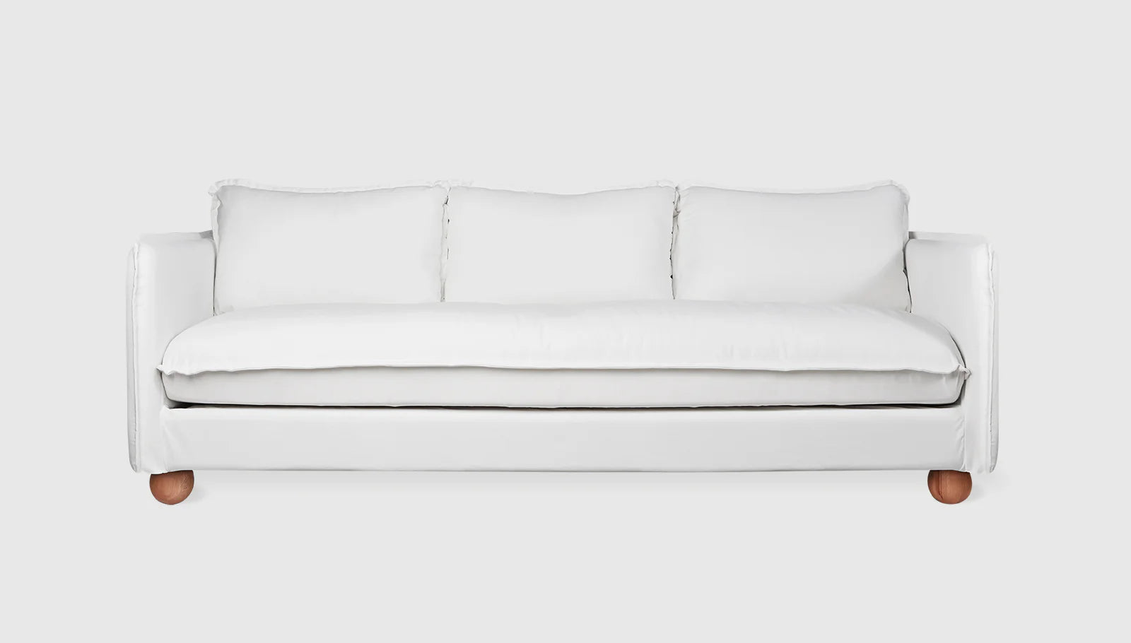 The Monterey Sofa embodies a laid-back, coastal vibe, with a deep seat and luxurious back cushions, perfect for lounging on a lazy Sunday. Solid wood, spherical feet add an organic touch. The Monterey is both environmentally and family-friendly, with machine washable slipcovers (White Wash Denim fabric only) and PET filled cushions. This sofa is constructed with kiln-dried FSCĀ®-Certified hardwood, in support of responsible forest management. Monterey uses a clean, ultra soft, long-strand fiber fill material that offers the comfort and feel of traditional waterfowl down. This material is created through a process that benefits the environment by diverting 748 plastic bottles away from landfills, waterways and oceans for each Monterey Sofa we build.