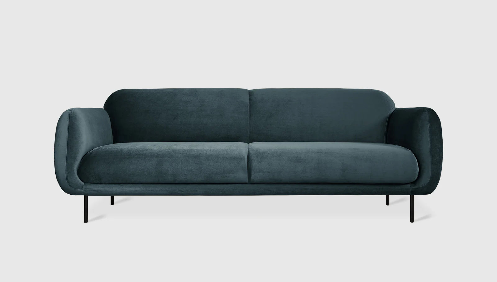 Envelop yourself in mod luxury with the plush and sophisticated Nord Sofa. With an elegant, curved silhouette, the Nord Sofa invites you to sink in and stay awhile, with a retro yet timeless shape that’s emphasized by an ample, low profile back and feminine curved arms. Each piece has been expertly crafted in lush fabric, with a tight seat and back atop black steel legs that add a modern touch to the piece’s striking ‘70s-inspired sensibilities.